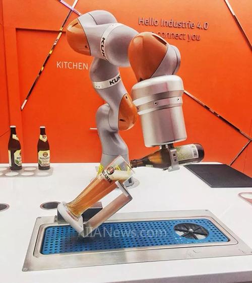KUKA 家的展臺必有個(gè)吧臺區(qū),吧臺區(qū)里必有明星產(chǎn)品:LBR iiwa 的駐守。這款世界上首臺 7 軸靈敏型機(jī)器人,在“人機(jī)協(xié)作”領(lǐng)域里一直所向披靡,遇上展會這樣的機(jī)會,也總愛秀秀自己那精湛的倒啤酒絕技,這次,在吧臺區(qū),LBR iiwa 又收獲了一大幫迷弟迷妹!